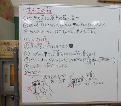 1年生の視力検査を行いました。1学期に続き、2回目の視力検査ですが、みんな輪っかの切れ目をしっかりと指さして、前後のあいさつもきちんとできていました。すばらしいですね。