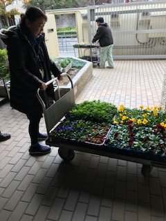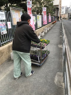 先日出荷式を終えたパンジー・ビオラ・ノースポールを、中津福祉会館に持っていきました。