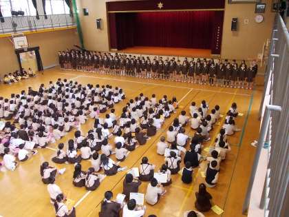 全校児童で「犬のおなか」「あくびのでるうた」で発生練習をし、