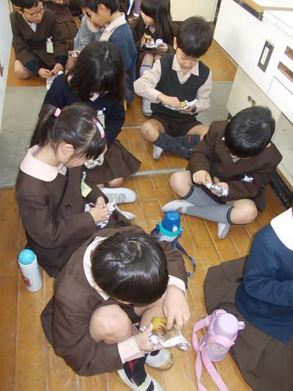 学習園で育てたさつまいもをふかして食べました。2学期のいろいろな行事をがんばったごほうびの「さつまいもパーティ」です。