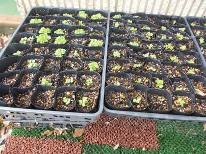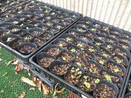 が、下の写真のように、「1ポットに3粒」ではなく、大量に芽が出ているものもあったり、まったく1つも出ていなかったりしているものも多数・・・。
