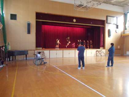 長なわ大会に向けて、児童集会で説明する練習をしました。