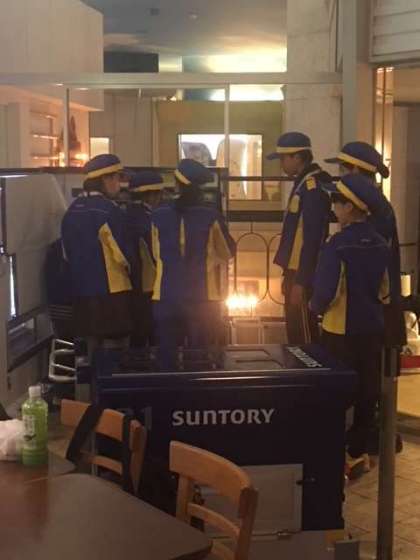 いよいよここでの体験も終わりに近づいてきました。サントリーのボトリング体験、ゾフの眼鏡屋さんなど、それぞれに楽しむ姿があちこちで見られました。どの子も、ユニホームに身を包み、照れながらこちらに手を振る姿がとても可愛らしいなと思った一日でした。