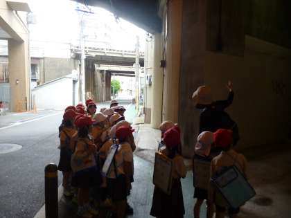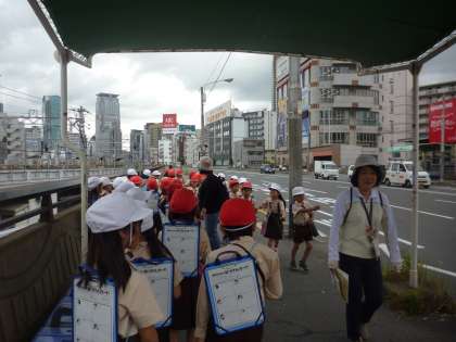 道路は安全に、横に広がらないように歩きました。阪急高架下の階段を上がると、上の広い道路の向こう側に、大阪市バスが何台も止まっているのが見えました。中津7丁目付近を消防自動車が巡回していたり、いつももらっているおまんじゅうの松月さんの店の前では、いいにおいがしたりしました。
