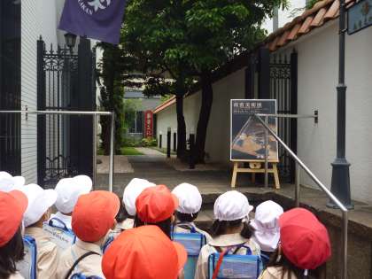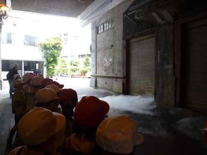 そして、中津の町にある「南蛮文化館」の前に。ちょうど春の開館時期でした。阪急高架下のドライアイスのけむりを喜びながら、中央公園に到着しました。
