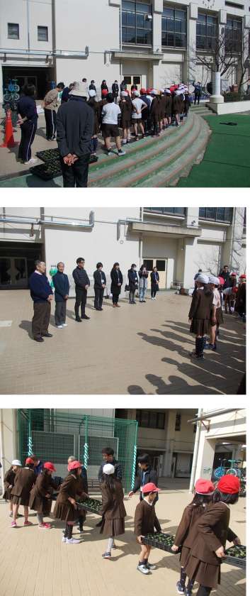 3年生と環境美化委員会がそだてている菜の花の出荷式を行いました。地域活動協議会会長、社会福祉協議会会長、大淀警察署、PTAの方々など、お越しいただきました。