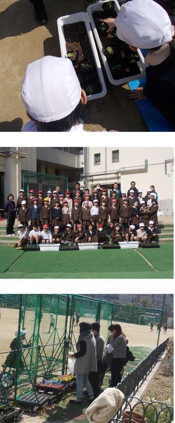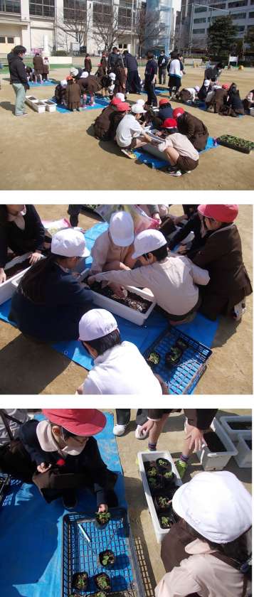 セレモニー後、ポット苗を、プランターに植え替える作業をしました。1つのプランターに9つのポット苗を植えます。