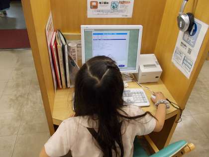 図書館では初めに図書館についてのお話やパソコンの説明を聞きました。