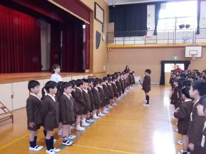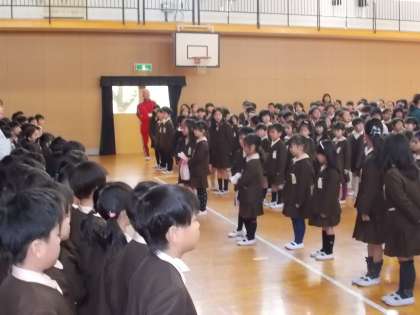 対面式を行い、先日に入学した1年生と、2年生から6年生までの児童が初めて顔を合わせました。