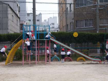 1年生が体育の学習をしている様子です。運動場のアスレチックを使って楽しく運動しています。ほかにも、鉄棒を使った運動や、かけっこなどをしています。