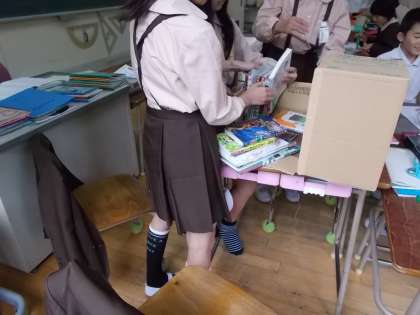 写真は季節に合わせた掲示物をつくる掲示係と、学級文庫の整理の仕方を考える図書係です。