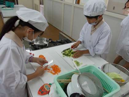 昨日の2組に続き、今日は5年1組が調理実習を行いました。包丁を使い慣れている子や恐る恐る使う子もいましたが、どの班も「おいしい!」と言って食べていました。