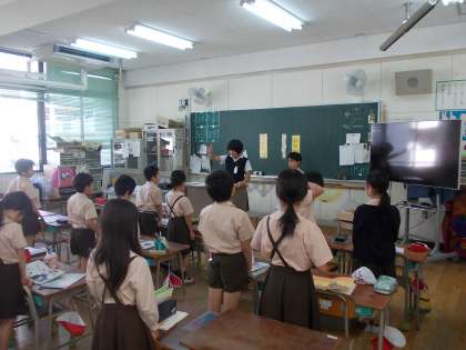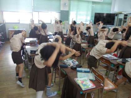 健康委員会が各教室を回り、姿勢の話をしたり、しせい体操を紹介して一緒にしたりしています。
