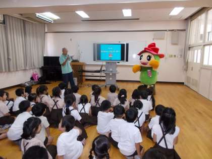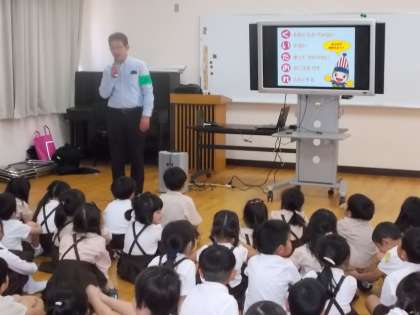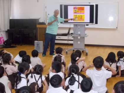 「あんまち隊」の方による1年生への出前授業がありました。「くいだおれ」を合言葉に、知らない人に気をつけようというお話でした。