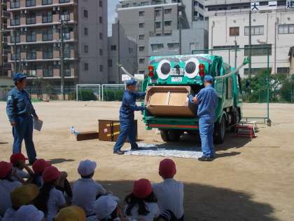 パッカー車の中で大きな音でつぶされるタンスを見て、想像以上の迫力に驚いていました。ごみの分別体験では、実際にやってみると意外と難しく、全問正解とはなりませんでした。今後もごみを減らす取り組みをしていってほしいと思います。
