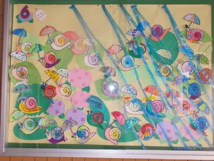 6月の玄関掲示は3年生が作成しました。たくさんのかたつむりがカラフルな傘をさしています。中津小学校にお立ち寄りの際はぜひご覧ください。