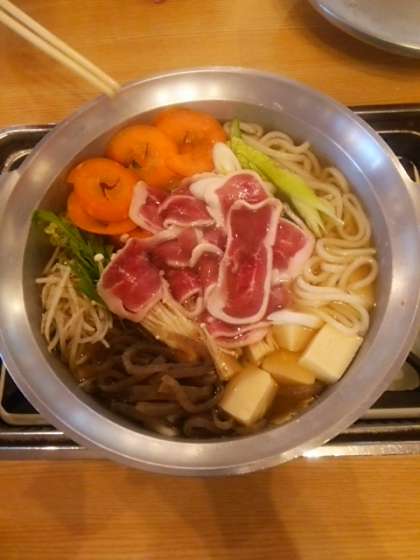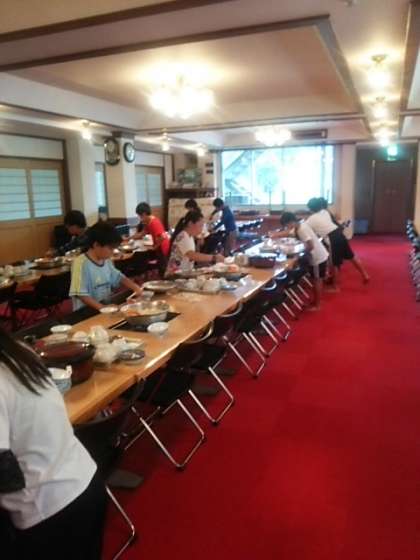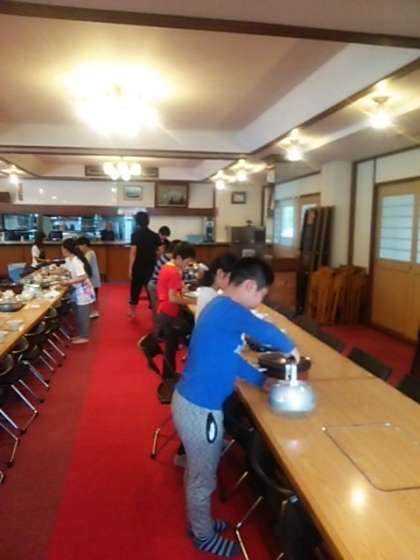 入浴を終え、係が夕食の準備をしています。今日はかも鍋です。