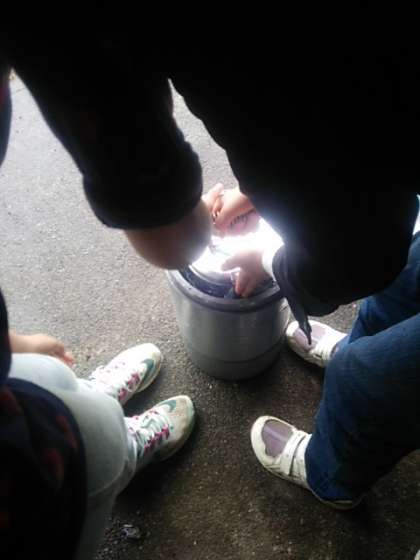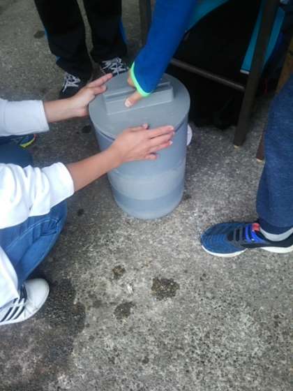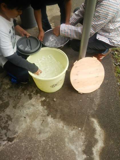 材料をまぜ容器に入れました。氷、塩とともに樽にセットしました。このあと、樽を20分ほど転がして完成の予定です。
