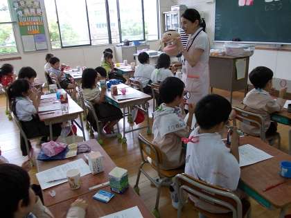 今日は歯みがき練習の最終日。1-2です。見えなかった歯垢が赤く染まってびっくり。小さく優しく1本ずつ歯みがきしました。