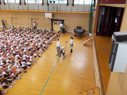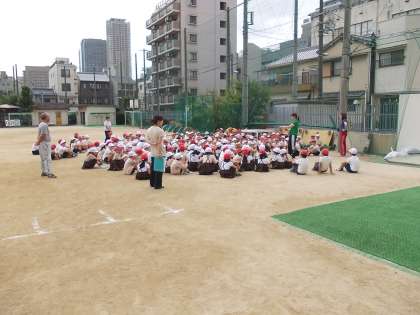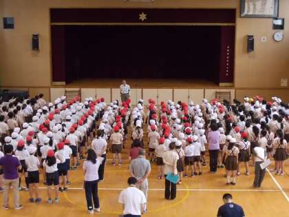 子どもたちは近くの教室に入って鍵をし、運動場で遊んでいる子は1か所に集まります。安全が確保できたのち、全員が講堂に集合しました。