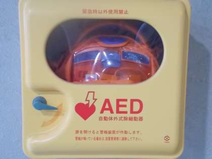 本校では、AEDは玄関ホール(管理作業員室前)、講堂の北側入口付近の2ヶ所に設置しています。