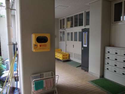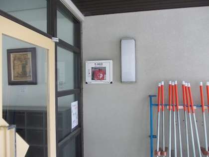 本校のAED、1つは、ピロティの竹馬の横にあります。