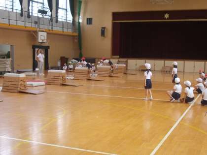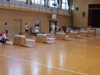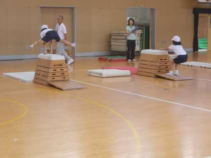 まず開脚跳びの発表会です。大きな動作で演じます。