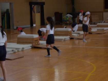 次は、いよいよ台上前転です。準備運動をしっかりして、自分に合ったセッティングを選びます。