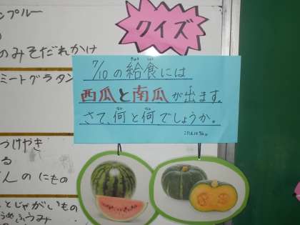 給食室前には、昨日から、「西瓜と南瓜がでます。さて何でしょう?」というクイズが掲示されていました。今日の給食の時間には、栄養教諭が各教室へ正解発表に行きました。「すいか」や「かぼちゃ」といった言葉は出るものの、漢字が逆だったり、中には「メロン」と答えたりする児童もいました。正解は「西瓜(すいか)」「南瓜(かぼちゃ・なんきん)」ですね。