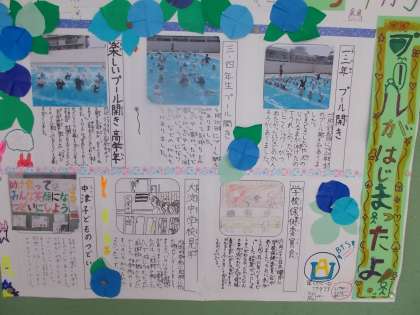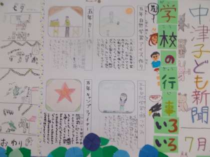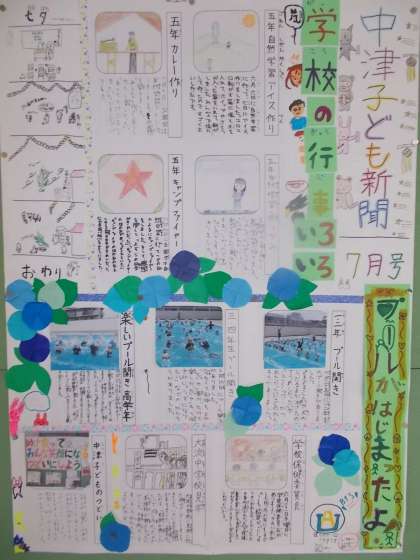 新聞委員会が作成した「中津子ども新聞 7月号」が職員室前に掲示されています。自然学習やプール開きなど、6月の行事についての記事が掲載されています。どうぞご覧ください。