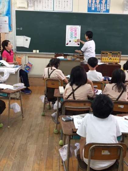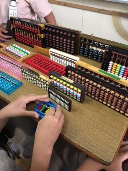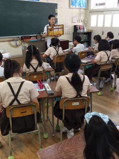 本日、そろばんの出前授業の2回目がありました。講師の先生は、前回に引き続き澤田悦子先生です。澤田先生は、旭区で「菊水はしでら珠算教場」を開いておられ、大阪市の中では、大変有名な先生です。澤田先生は、今日も子ども達のために、様々な種類のそろばんをもってきてくださいました。