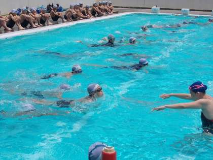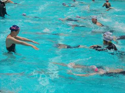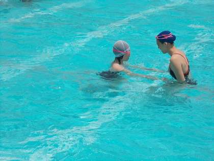 4時間目は、場所をプールに移して、水泳を楽しく教えていただきました。長崎県の出身で、海で泳ぐのがとても大好きな少女だったそうです。