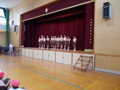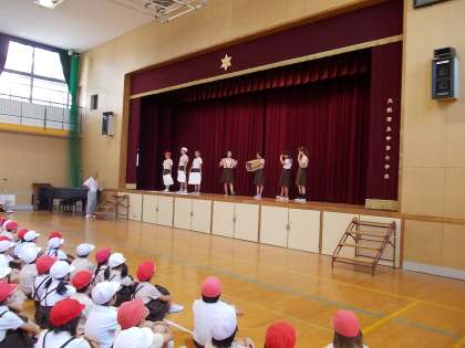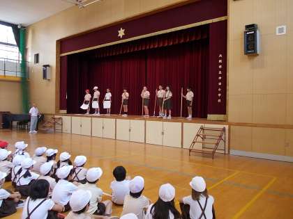 くつ箱への整理整頓の仕方、掃除道具(ほうき・ぞうきん)の使い方、節電について、ごみの分別について、寸劇とクイズの形で発表しました。