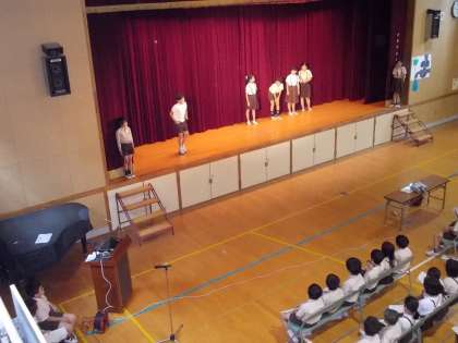 「手洗いについて考えよう」の議題で学校保健委員会を行いました。4〜6年生と保護者30名ほどの参加でした。健康委員会の児童が司会進行と、発表をしました。プロジェクターを使って健康週間の結果を報告したり、劇をしたりする中で、手洗いの大切さを学ぶことができました。