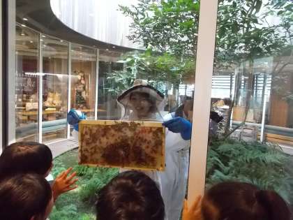 養蜂場の見学では、たくさんのミツバチに大きな歓声があがりました。女王蜂を見つけることもできました。養蜂場には、岡先生が入らせていただきました。