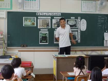 給食室たんけんをして、かま、やさいさいだんき、やきものきなどの機械を教えてもらいました。