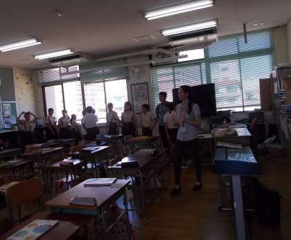 毎週水曜日の5時間目はYMCAインターナショナルスクールの先生が授業に来てくださっています。2学期からはオーブリー先生の授業です。初回の今日は6年1組での授業でした。