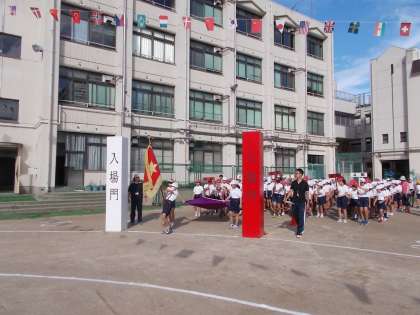 運動会の全体練習を行いました。本番と同じように入場行進、開会式と通して行いました。入場行進では、練習を重ねたプラカード担当の児童を先頭に、堂々と行進する姿が見られました。雨天の日が多く、運動場での練習が少ないですが、毎日どの学年も集中して練習に取り組んでいます。