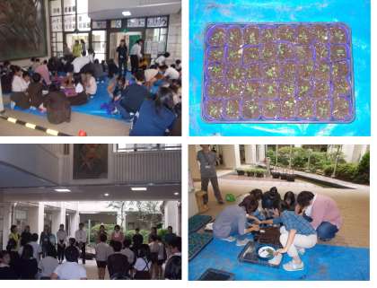 この活動は、苗、土、ポット、肥料などの資材は、大阪ターミナルビルから提供していただいています。大阪府農林水産部や大阪市の公園緑化部の方々には技術支援をしていただいており、今日も2人の方が指導に来てくださりました。