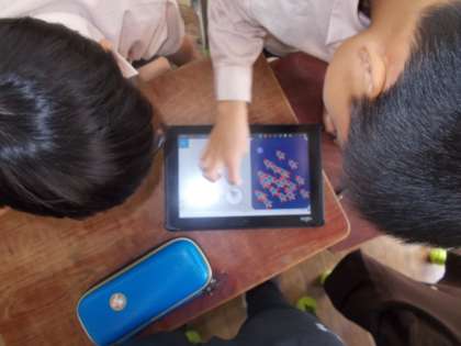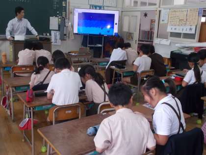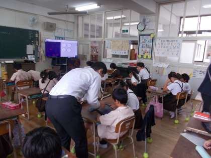 鈴木教頭先生とICT支援員の大迫先生にお手伝いしていただき、タブレット端末を使ってプログラミングの学習をしました。ロボットを自分が思った方向に飛ばすにはどうしたらいいか考えて操作しました。