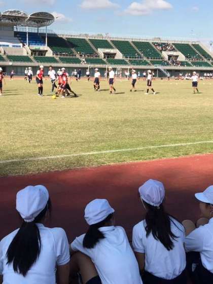 ドッジボールは見事な勝利でした。次は、菅北小とサッカーの対戦です。「中津!中津!」と、応援の声が響いて、みんな元気です。