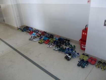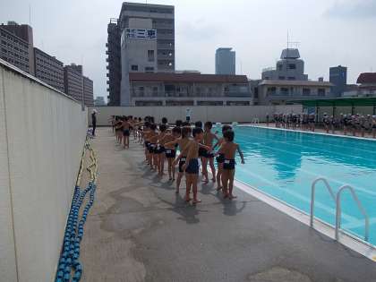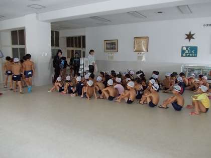 男子は図工室、女子は多目的室で着替えて、(くつがちゃんと並んでいるのはさすがです!)ふれあいホールで出席をとります。プールサイドで体操です。