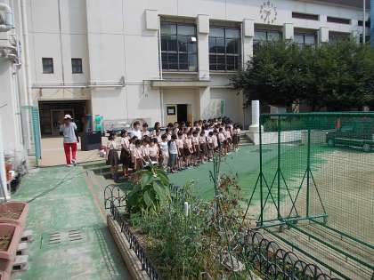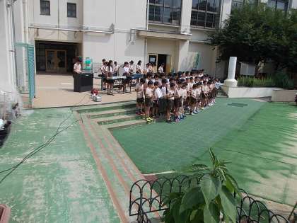 音楽室で一度練習した後、ピロティで実際に演奏してみました。