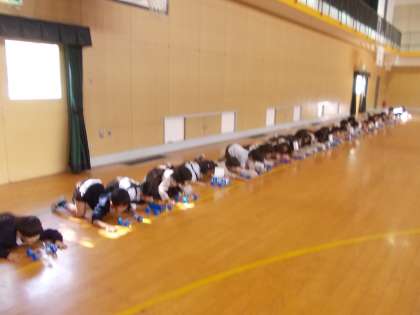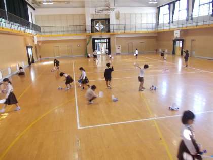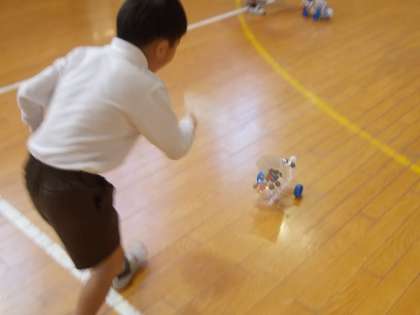 ペットボトルや洗剤の箱、牛乳パックなどを使って風で動くおもちゃを作りました。タイヤの位置を考えたり、風をうけるように羽をつけたり、工夫をしていました。今日は、作ったおもちゃを、息を吹いたり、うちわであおいだりして動かしました。