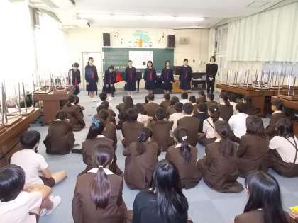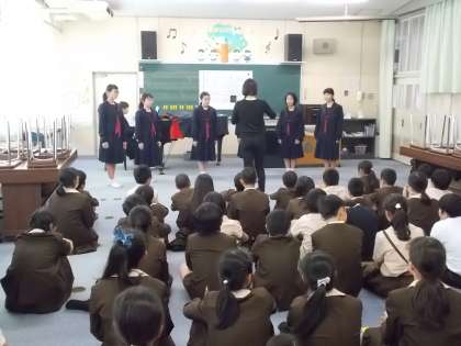 大淀中学校合唱部の来訪があり、6年生児童に合唱を披露してくださいました。先輩たちの美しい歌声に聴き入っていました。