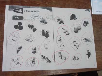 ベンジャミン先生と「I like 〜」の学習をしました。ベンジャミン先生の話す英語を聞いて好きなものを当てるゲームをし、とても盛り上がりました。