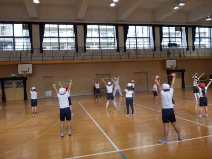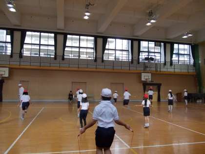 今日のなわとび出前授業は3年生です。ふわりと跳んで、音を消して着地する、ということに気をつけて跳ぶことを教わりました。また、あやとびや交差とびでは、できるだけ大きな輪をつくるようになわの持ち方や腕の使い方を教わりました。子どもたちは説明をしっかり聞き、教わったことを意識しながら練習を繰り返していました。