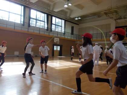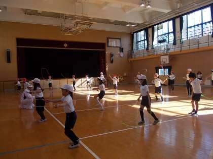 今日のなわとび出前授業は4年生でした。短なわでは、あやとびの練習をしました。長なわでは、回し方、入り方、跳び方を教わりました。なわの長さや技に関わらず、音をたてないように跳ぶことを意識しました。また、二人で入り、跳びながらじゃんけんをしました。いろんな跳び方が上手にできるようになりました。