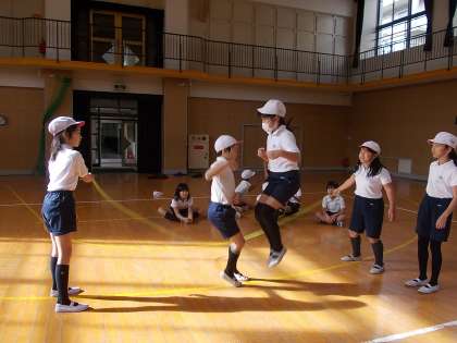 お昼休みには、友達どうしで声をかけあって、さっそく長なわに取り組んでいました。
