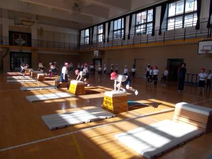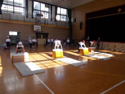 跳び箱運動の学習で、開脚とびと抱えこみとびをしました。段階をふんで練習を繰り返し、抱え込みとびができる児童が増えました。また、友だちや先生の助言を素直に聞き取り組む姿が見られました。